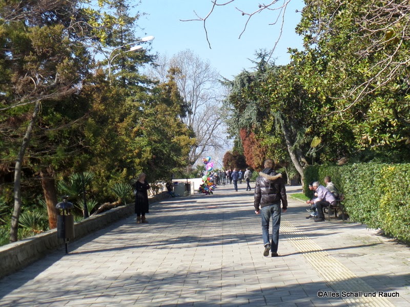 Сочи расположен на берегу моря, и город очень напоминает Ниццу или Канны, с пальмами и субтропической растительностью. Побережье здесь ценится как Лазурный берег России. Существует прекрасный парк и променад вдоль моря, окаймлённый парковыми скамейками и люди сидели там и наслаждались солнечными лучами как весной.