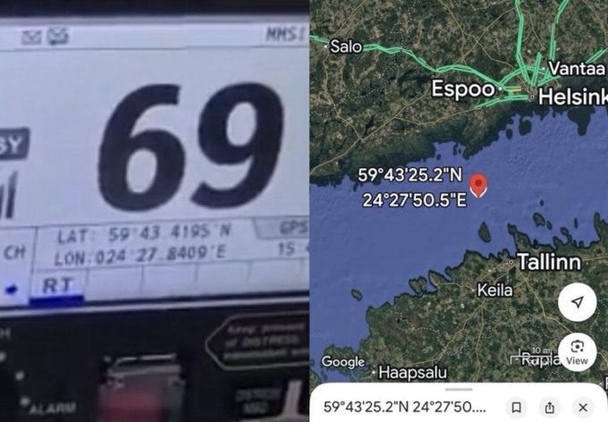 Возвращаясь к теме: экипаж корабля снял на видео, как эстонские военные вертолёты пытались запугать их, чтобы они зашли в эстонский порт. На скриншоте их панели управления мы видим точные координаты корабля: 59°43'25,2" северной широты, 24°27'50,5" восточной долготы: